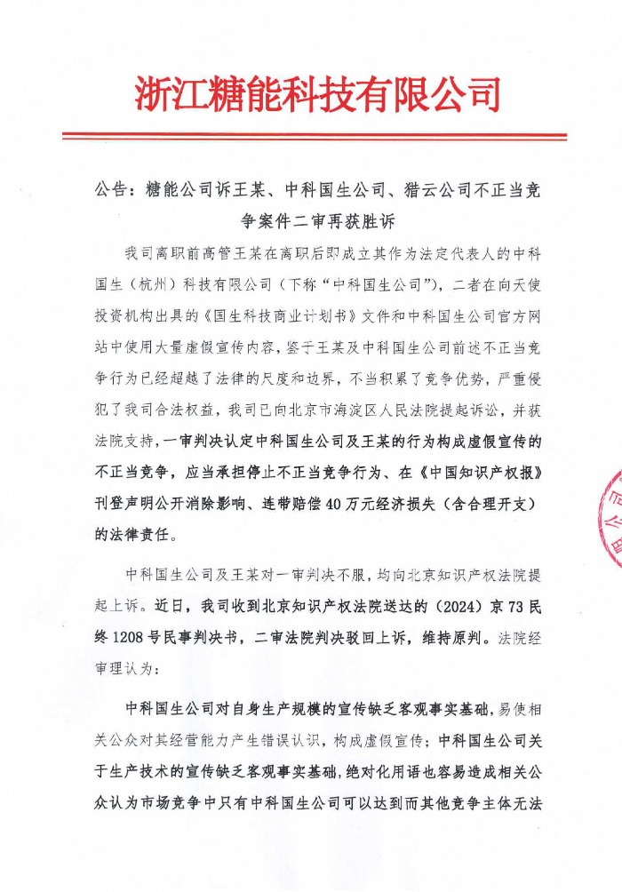 Tillkännagivande: Sugar Energy vann den andra rättegången i fallet med illojal konkurrens mot Wang, Zhongke Guosheng Company och Lieyun Company